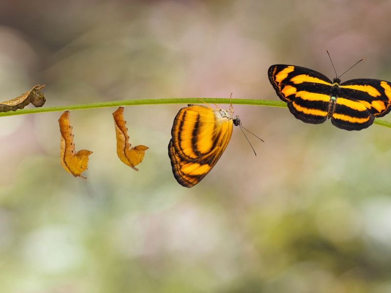Quando as lagartas estão prontas para a metamorfose, fixam-se a um suporte por meio de uma pequena bola de seda. Em seguida, transformam-se em pupas. Dentro desse casulo rígido ocorre uma reorganização completa do organismo ? um dos processos biológicos mais impressionantes da natureza.